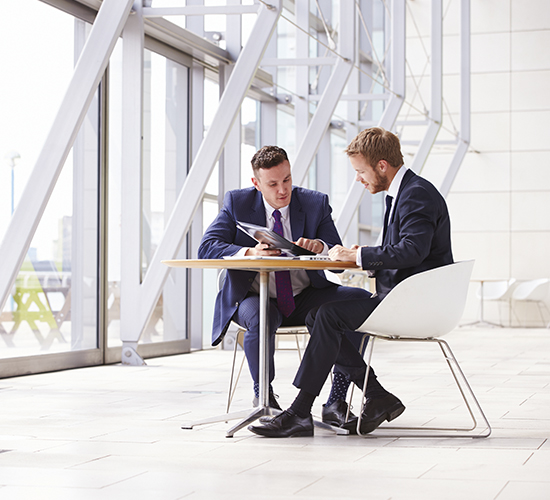 Two businessmen discussing work in the office - R Collins & Co Insurance Brokers